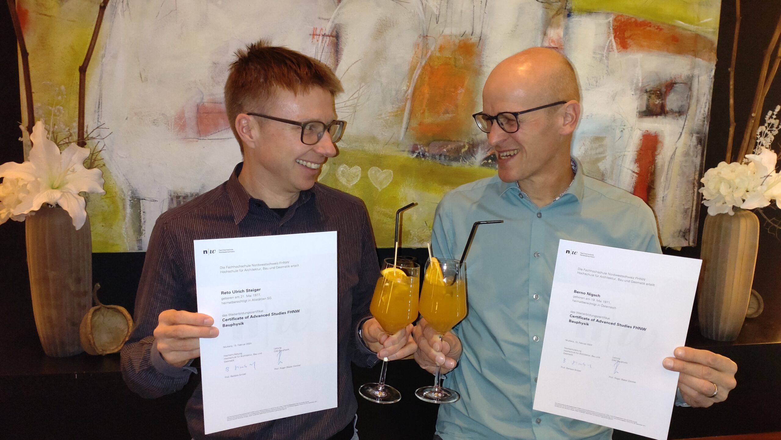 Foto: Reto Steiger (STUDER + STRAUSS AG, St. Gallen) und Berno Nigsch (BenAkustik GmbH), das Team der Zertifikatsarbeit „Schimmelpilzbefall im Wohngebäude – bauphysikalische Analyse inklusive Messung“ bei der privaten Diplomfeier 😊
